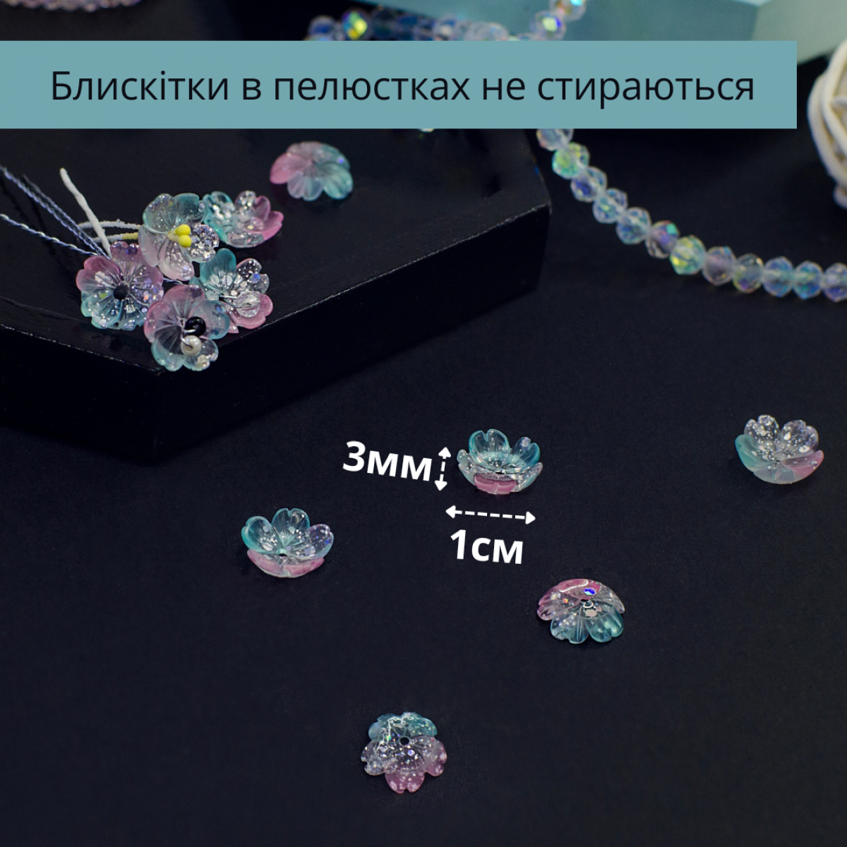 Квіти декоративні, акрилові. За допомогою таких намистин можна створювати квіткові композиції, вінки на голову, браслети, намисто та інші прикраси, також квіти не рідко застосовують в інших видах рукоділля, скрапбукінгу, а також для пакування подарунків.