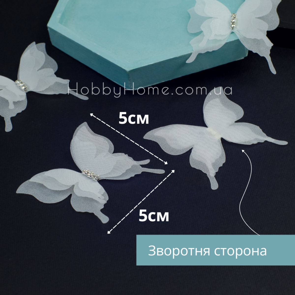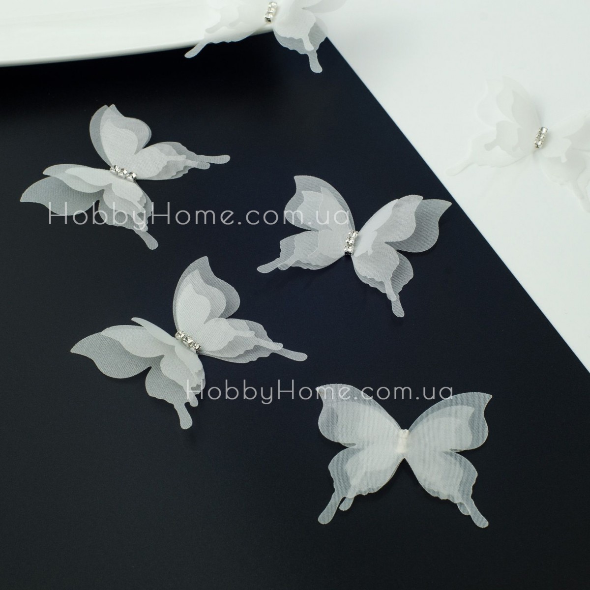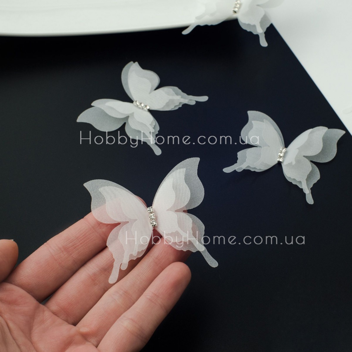 Цей білий шифоновий метелик — справжнє втілення ніжності. Тришарова структура створює ефект живого об’єму, а блискуча серединка зі стразами додає святкового шарму.