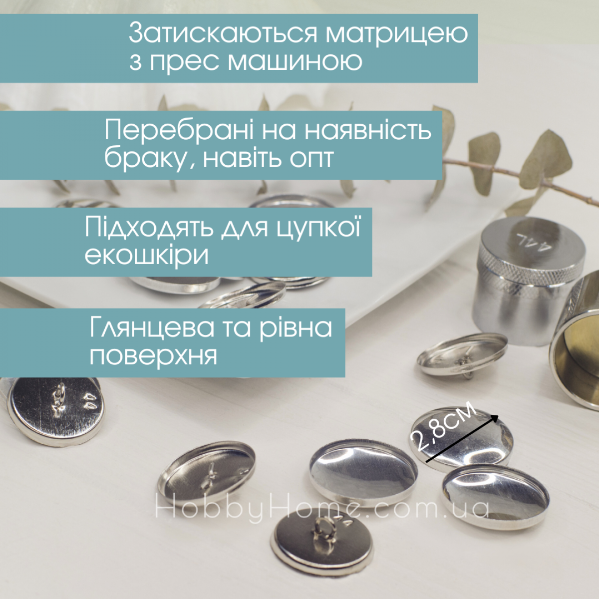 Гудзики створені спеціально для використання з пресом і металевими матрицями. Вони не підходять до пластикового ручного пресу, але забезпечують ідеальну якість при серійному виготовленні прикрас, декору та елементів інтер’єру.