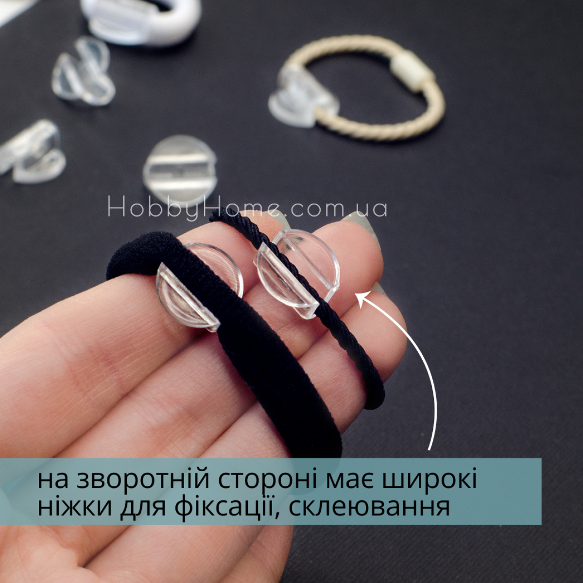 Прозора кругла основа для резинки (велика) — зручне кріплення для ширших резинок. Кругла прозора основа великого розміру — це універсальне рішення для створення оригінальних прикрас на волосся. Завдяки збільшеному вушку вона підходить для ширших резинок, що робить її особливо зручною для масивніших виробів і міцнішого фіксування.