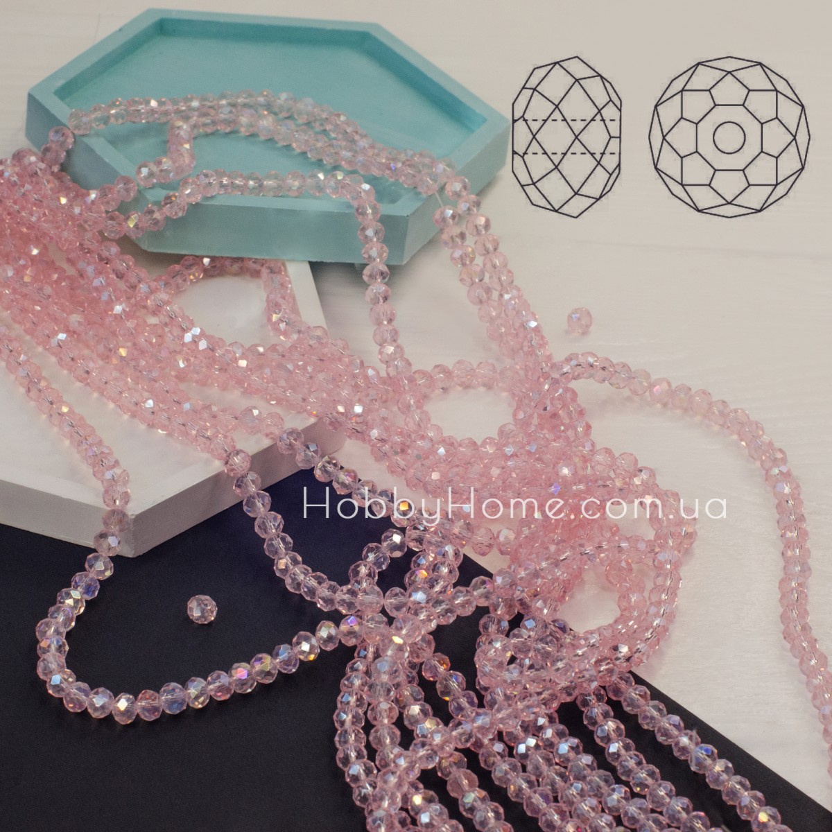 Ці намистини ронделі 4×6 мм у рожевому напівпрозорому кольорі з АВ-покриттям мають витончену огранку, що створює ефект мерехтіння при кожному русі. Вони чудово підійдуть для створення ніжних прикрас — від сережок до прикрас у стилі бохо або весільних аксесуарів.
