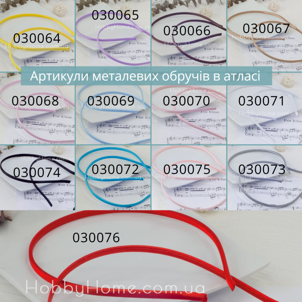 В асортименті є 13 кольорів на ваш вибір, також є обручі інших розмірів та кольорів, широкі та вузькі, пластикові та металеві.