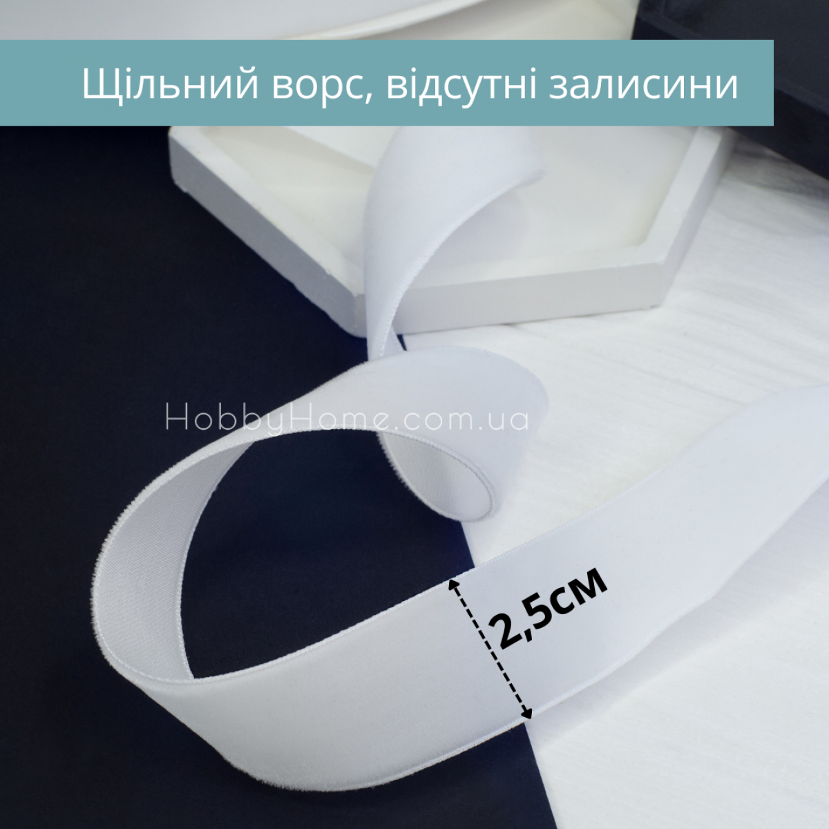 Біла оксамитова стрічка шириною 2,5 см — улюблениця майстринь! Її приємна на дотик текстура, щільна структура та класичний білий колір роблять стрічку безпрограшним варіантом для творчих проєктів і базовим матеріалом у хендмейді.