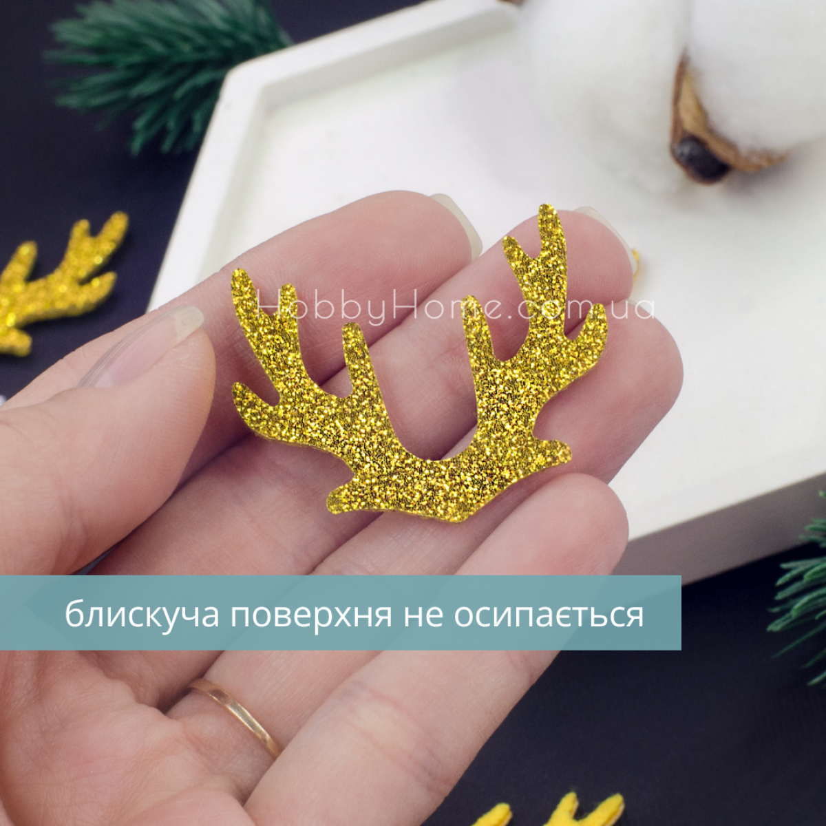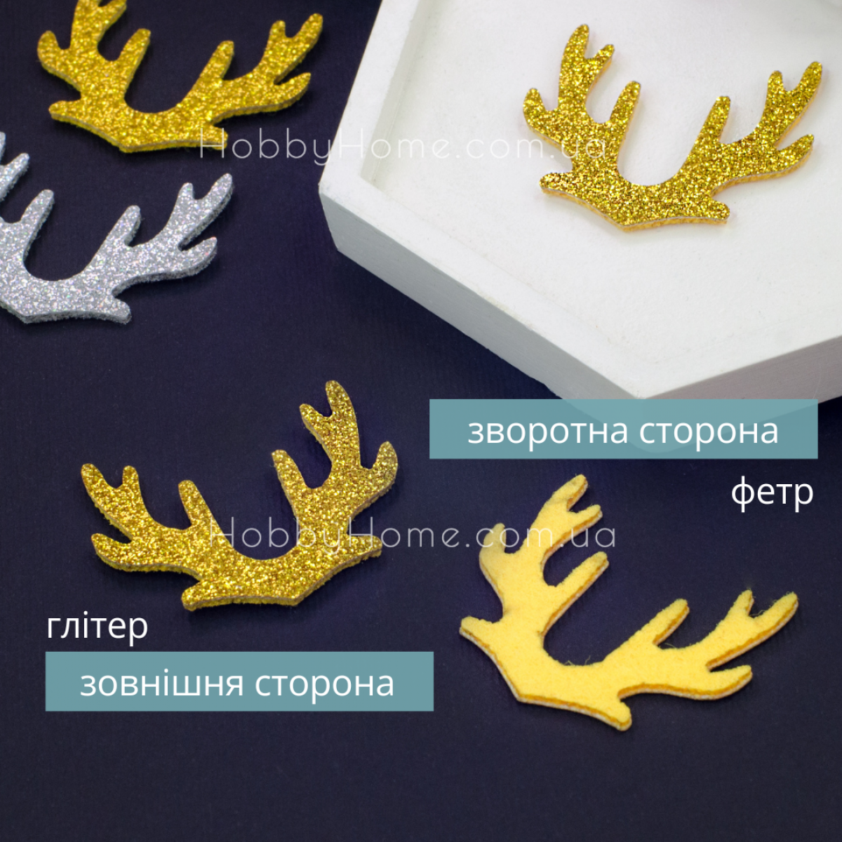 | тип | Фетрові ріжки оленя 4 см – колір золото, блискуча вирубка для хендмейду |