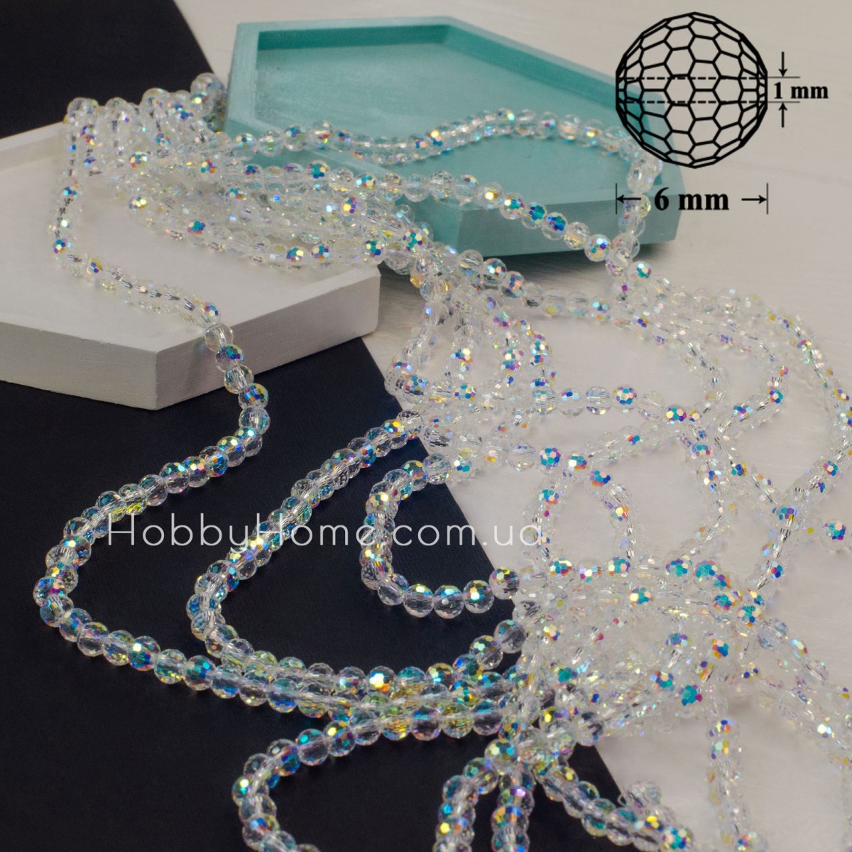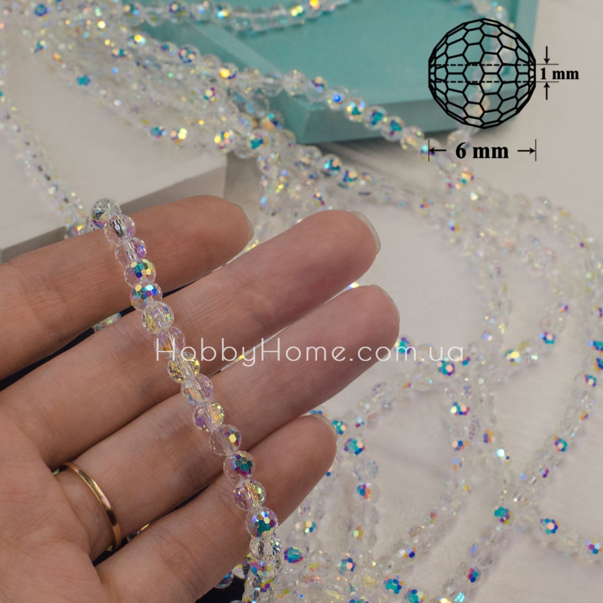 Ронделі Сфера 6 мм прозорі з АВ+ покриттям — це вишукані круглі намистини зі скла з додатковим ефектом сяйва. Покриття АВ+ (Aurora Borealis Plus) надає кришталевим гранованим поверхням яскраві переливи та інтенсивне світловідбиття. Завдяки цьому ронделі виглядають максимально ефектно в прикрасах, аксесуарах та декорі.