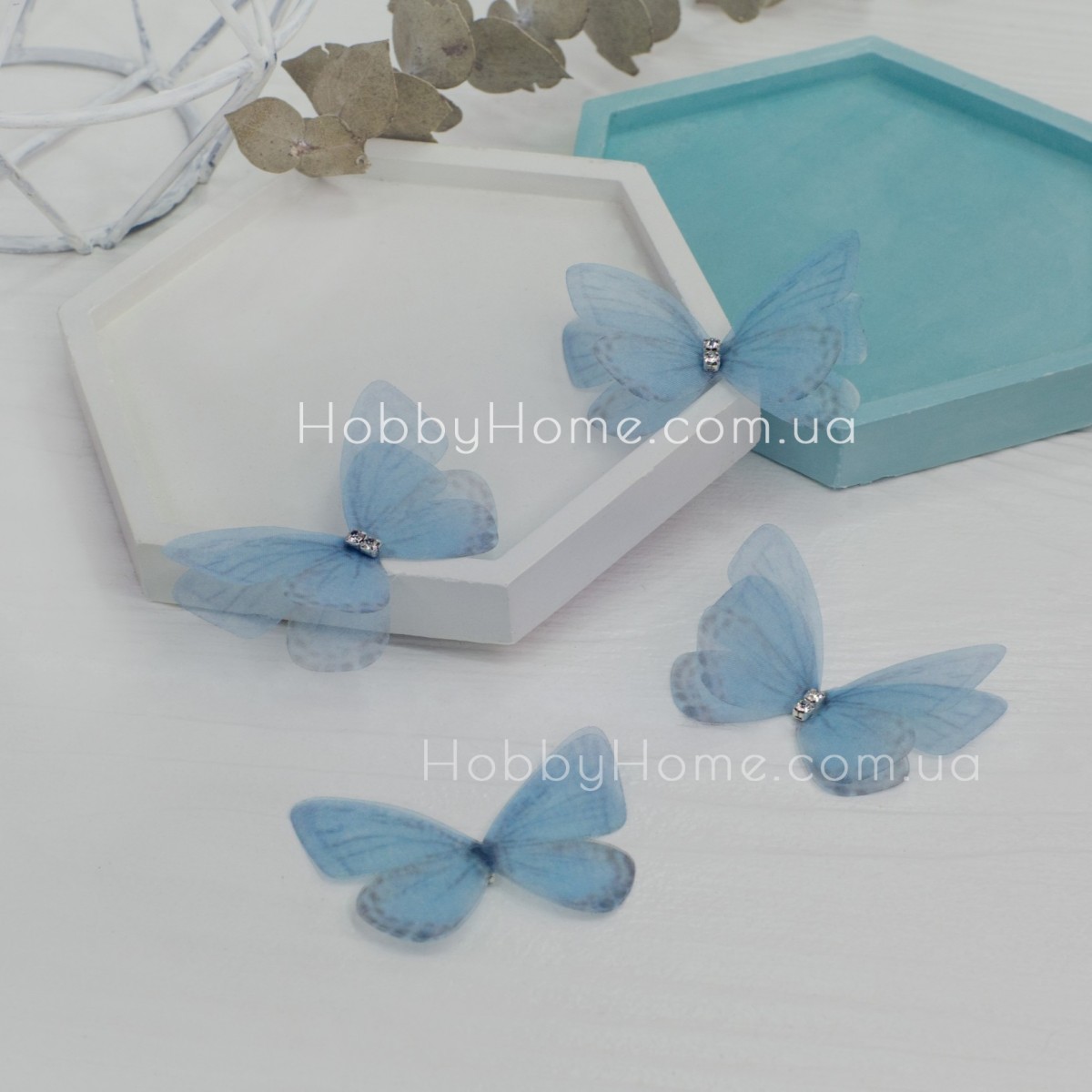 Шифоновий метелик 4,8 см блакитного кольору — ніжна, елегантна деталь для ваших творчих проєктів. Двошарова конструкція створює красивий обʼєм і легкий, напівпрозорий ефект, що особливо ефектно виглядає в декорі та рукоділлі.