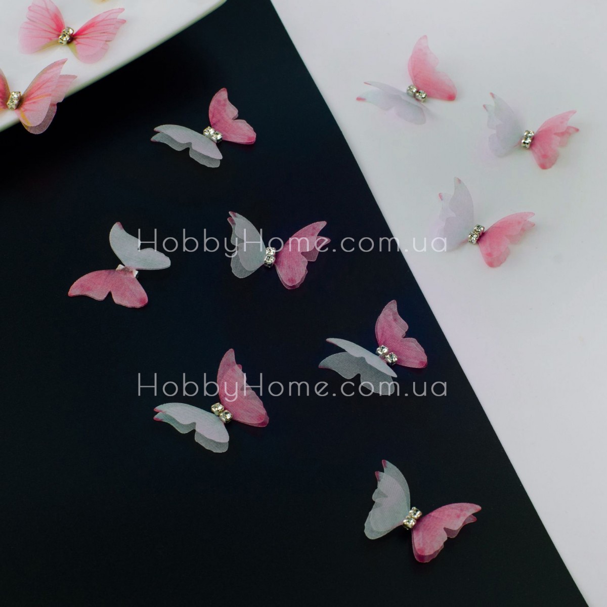 Ці двошарові маленькі шифонові метелики двоколірні біло рожевого кольору — справжній маст-хев для творчих людей! Вони виглядають обʼємно завдяки двом шарам крилець різного розміру, а прозорий шифон надає їм невагомості. У центрі сяє стразик — делікатний акцент, який додає блиску та шарму.