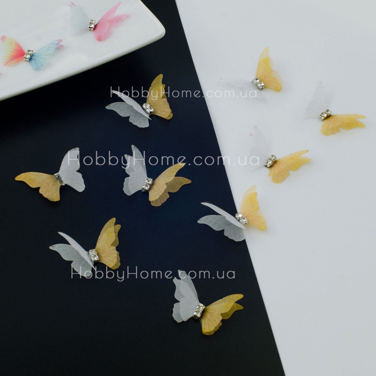 Ці двошарові маленькі шифонові метелики двоколірні — справжній маст-хев для творчих людей! Вони виглядають обʼємно завдяки двом шарам крилець різного розміру, а прозорий шифон надає їм невагомості. У центрі сяє стразик — делікатний акцент, який додає блиску та шарму.