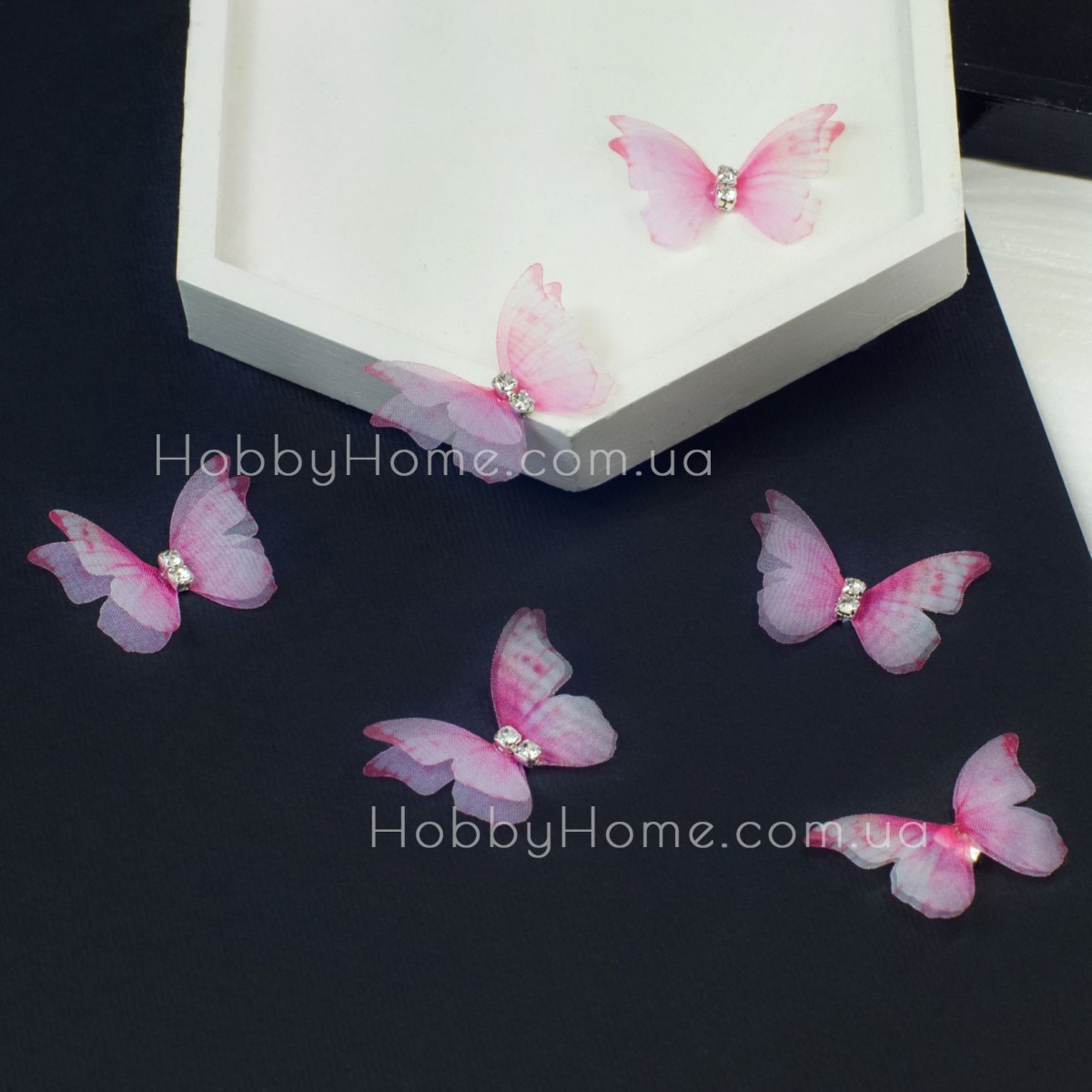 Ці двошарові шифонові метелики рожевого кольору — справжній маст-хев для творчих людей! Вони виглядають обʼємно завдяки двом шарам крилець різного розміру, а прозорий шифон надає їм невагомості. У центрі сяє стразик — делікатний акцент, який додає блиску та шарму.