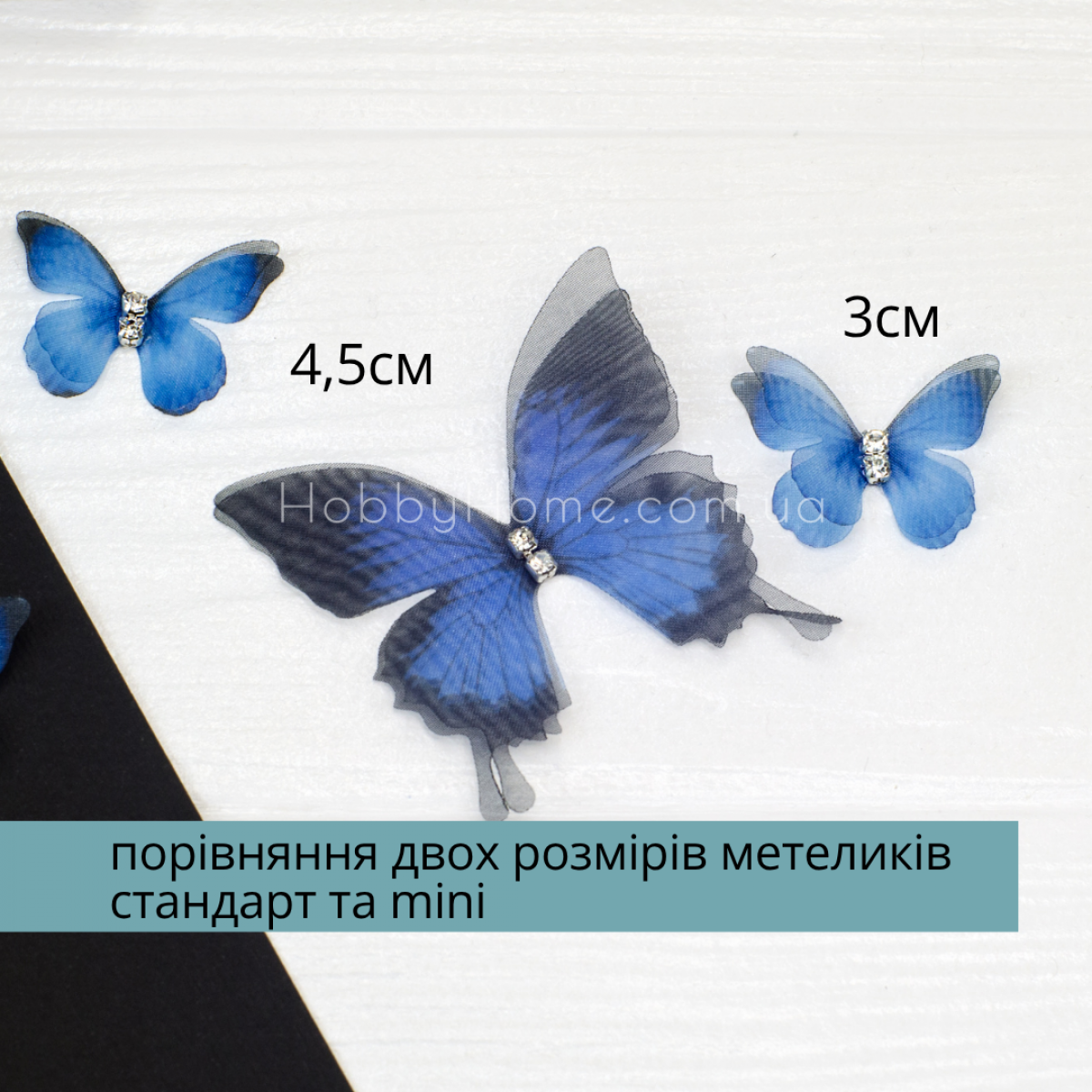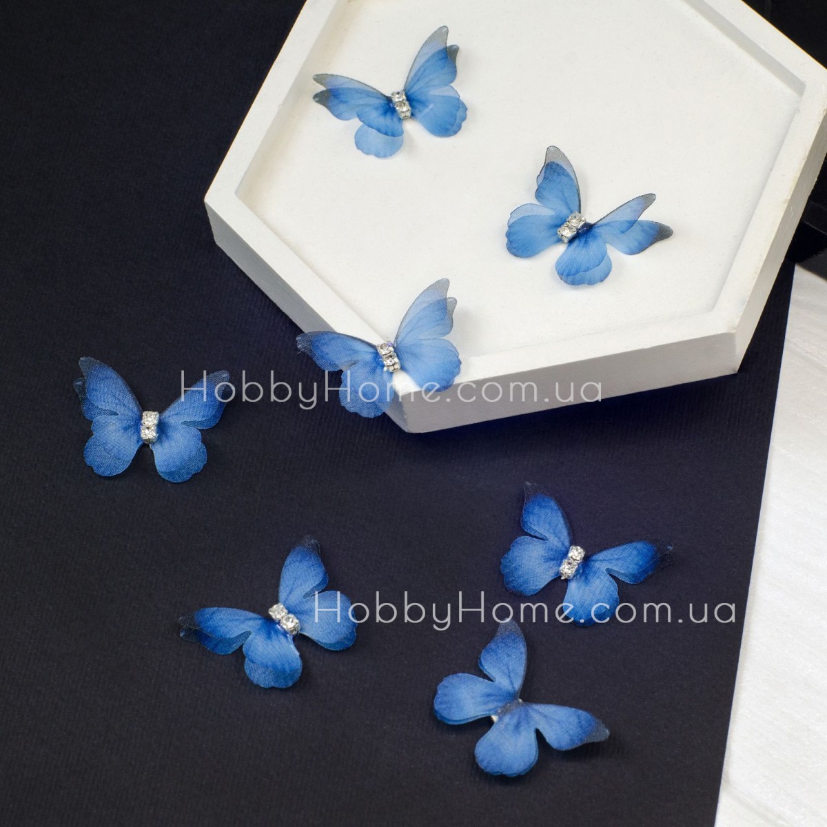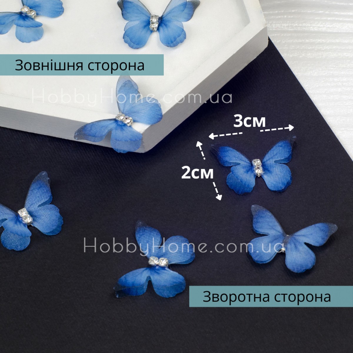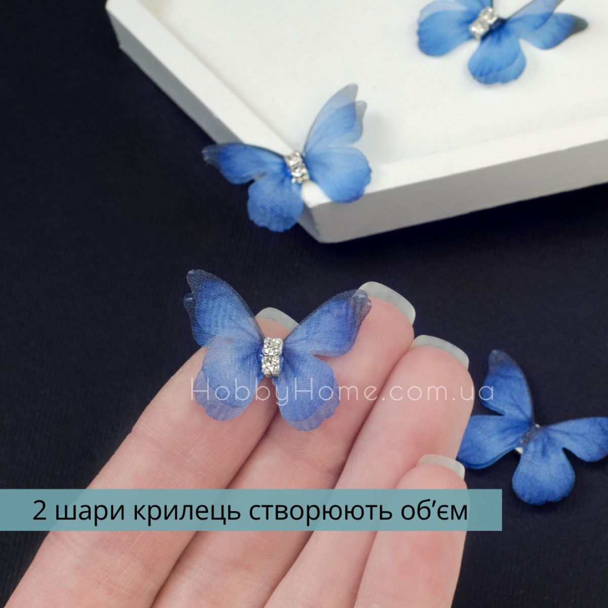 - Ці двошарові шифонові метелики синього кольору — справжній маст-хев для творчих людей! Вони виглядають обʼємно завдяки двом шарам крилець різного розміру, а прозорий шифон надає їм невагомості. У центрі сяє стразик — делікатний акцент, який додає блиску та шарму.