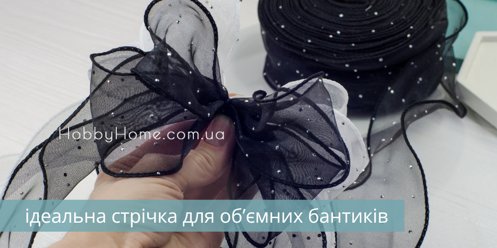 В наявності різні стрічки: органза зі стразами, з принтом та однотонні, оксамитові стрічки, фатин, сатинові стрічки, стрічки з листочками. Всі можна побачити тут.