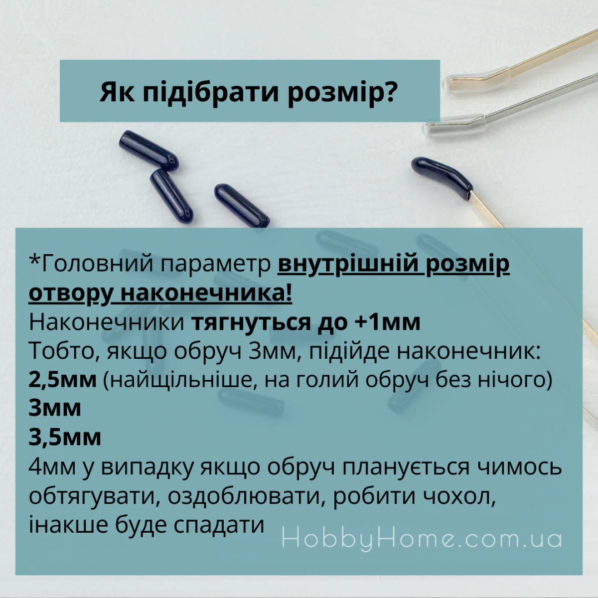 Використовуються як захисні гумові ковпачки, щоб кінчики фурнітури не дряпали шкіру голови, наконечники стримують фурнітуру аби вона не ковзала