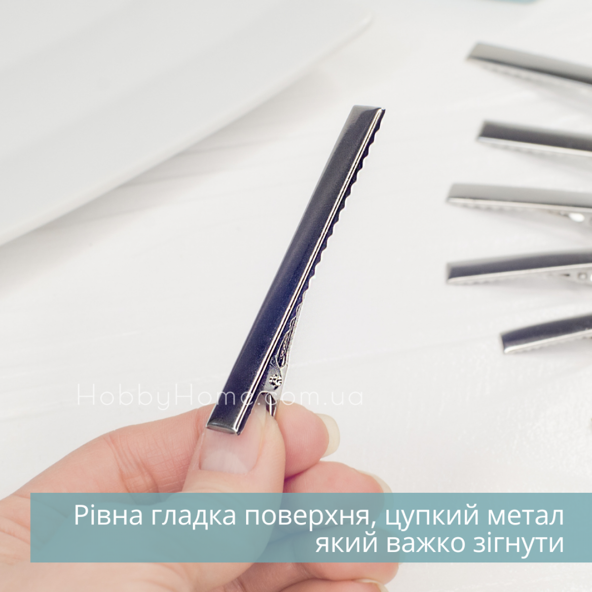 Заколка крокодильчик 6,5 см срібна— це надійна металева основа для заколки, яка ідеально підходить для створення авторських аксесуарів. Завдяки збільшеній довжині та потужному затиску, вона легко утримує важкі декоративні елементи: банти, квіти з фоамірану, фетру, глітерного матеріалу, тканини та іншого декору.